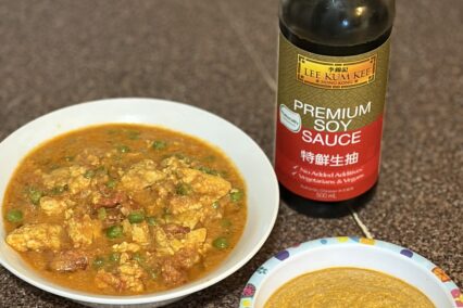 Spicy ABC sauce Tempeh and silken tofu with steamed rice and garlic green beans
